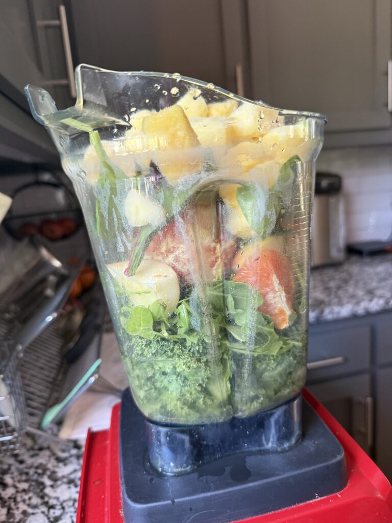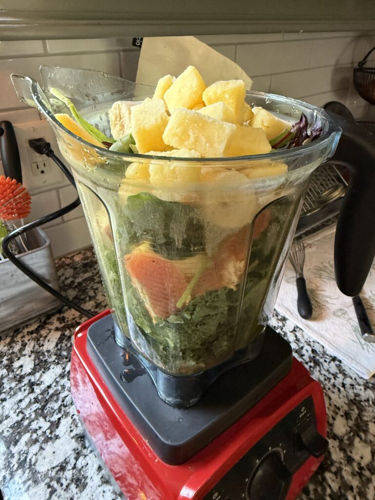 I put all of my ingredients into my Vitamix. If you don’t have a Vitamix I would suggest adding ingredients slowly to make sure you get things well-blended. Some people don’t like to chew their smoothies. 😉