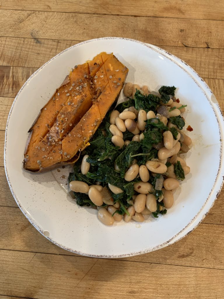 This recipe truly is delicious and oh so easy! I cook them for Kevin & me at least once a week for a lunch. As you see in the photo above, today I added a roasted sweet potato with butter, Ceylon cinnamon, and toasted & crushed coriander seeds. You can doctor your sweet potato just the way you like it!